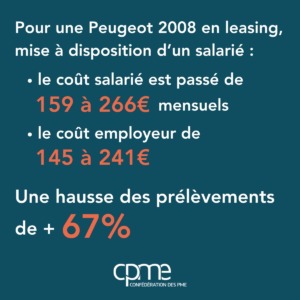 Pour une Peugeot 2008 en leasing, mise à disposition d’un salarié : le coût salarié est passé de 159 à 266 € mensuels et le coût employeur de 145 à 241 €. Une hausse des prélèvements de plus de 67% ! Autant d’augmentation du coût du travail pour l’employeur et de baisse de pouvoir d’achat pour le salarié. Ce n’est plus supportable.